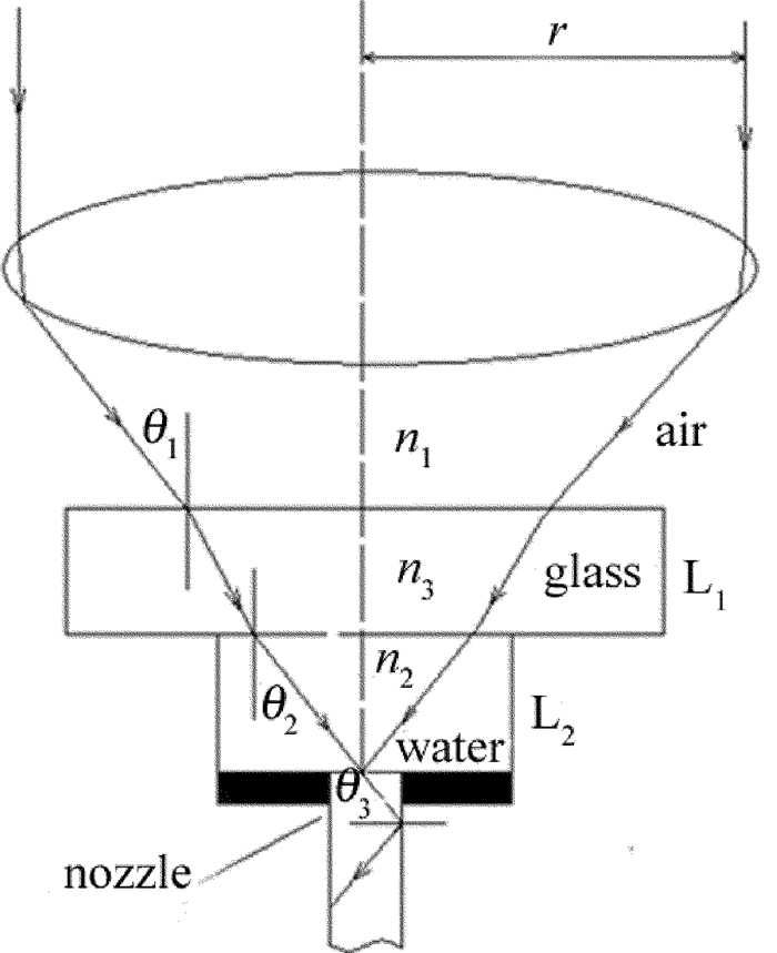 激光耦合即激光束在微水束中發(fā)生多次全反射后形成高能量束并在微水束中傳輸?shù)倪^程。耦合期間激光束要依次經(jīng)過空氣層、玻璃層L1、水層L2并進(jìn)入到水束光纖的開始端[13-14],如圖 1所示。
