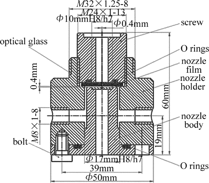 耦合裝置是實現(xiàn)激光與微水束耦合并傳輸?shù)年P(guān)鍵部件。耦合裝置主要由噴嘴體、進(jìn)水孔、O型圈、噴嘴支架等組成,如圖 2所示。本文中將噴嘴設(shè)計成圓柱形,目的是為了延長微水束的破碎長度。考慮到激光的能量密度比較大,且激光要在噴嘴內(nèi)部發(fā)生全反射,故噴嘴材料選用耐熱性比較好的銅。各參量具體數(shù)值為:噴嘴長度為10mm,噴嘴直徑為0.4mm,耦合間隙為0.4mm。噴嘴體頂部的定位圓柱體6與噴嘴支架4通過螺紋連接,高壓水從左右兩側(cè)的注水口注入耦合裝置,并進(jìn)入噴嘴體與光學(xué)玻璃之間形成的耦合間隙,然后通過噴嘴片上的噴嘴將耦合之后的光液高能束噴射出來。圖 3為耦合裝置的實物照片。