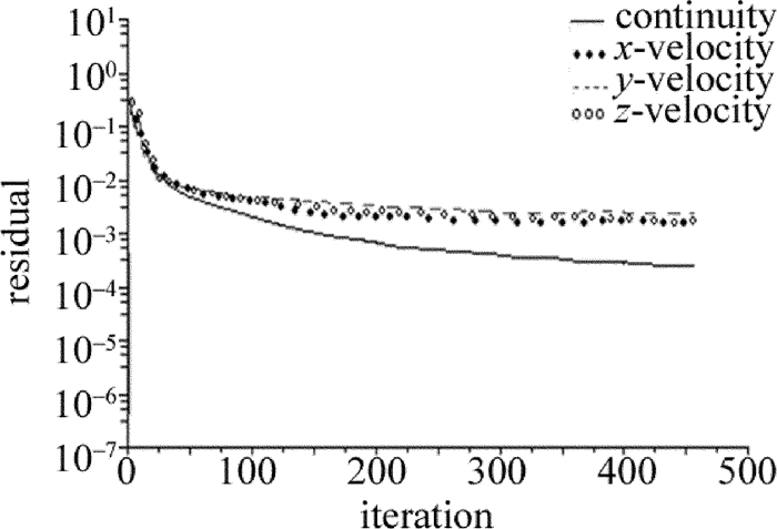 首先是殘差圖的收斂計算,設(shè)計的收斂參量為1×10-3。圖 4為殘差圖的收斂計算結(jié)果,橫坐標(biāo)為迭代次數(shù),縱坐標(biāo)為殘差值的大小。圖 5為單注水口耦合腔頂部水流入口壓力分布圖,縱坐標(biāo)為水束壓力大小(MPa)。由圖 5可以看出:當(dāng)水束壓力為10MPa時,水流入口處壓力分布非常不均勻,具有明顯的各向異性,且注水口一側(cè)的壓力明顯較大;隨著水束壓力的不斷增大,水束壓力的各向異性逐漸減弱,在水束壓力達(dá)到20MPa時,入口的水壓趨近均勻。