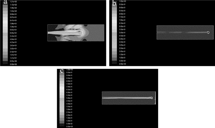 經(jīng)光液耦合后的水束噴射到空氣中的情況是比較復(fù)雜的。水束會在噴口處發(fā)生縮流,水束會突然縮小為原來的80%,然后水束在空氣壓力的作用下,其直徑又慢慢變大,最終導(dǎo)致激光束從水束中逃逸。噴嘴口的大小和水束的流速均會影響噴射流長度,本次仿真選取水束壓力為20MPa,依次對0.3mm, 0.4mm及0.5mm 3種口徑噴嘴射出的水束穩(wěn)定性進(jìn)行仿真,如圖 7所示。本次仿真設(shè)置的邊界為100mm。