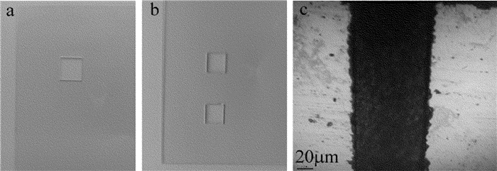 (2) 在噴口口徑為0.4mm、水束壓力為20MPa、激光功率為48W、切割速率為20mm/s時進(jìn)行玻璃的微水導(dǎo)激光切割。厚度為0.5mm及1.0mm的玻璃試樣的切割表面均比較光滑、基體內(nèi)無微裂紋存在,切縫寬度約為100μm,但1.0mm厚的玻璃試樣切割邊緣有毛刺及崩邊現(xiàn)象出現(xiàn)。