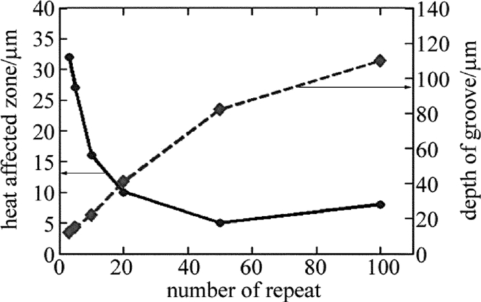 (3) 掃描深度隨著掃描次數的增加呈非線性增加,而隨著掃描次數的增加熱影響區有一定的減小,當重復掃描20次時,可以保證熱影響區較小的同時有較高去除效率。