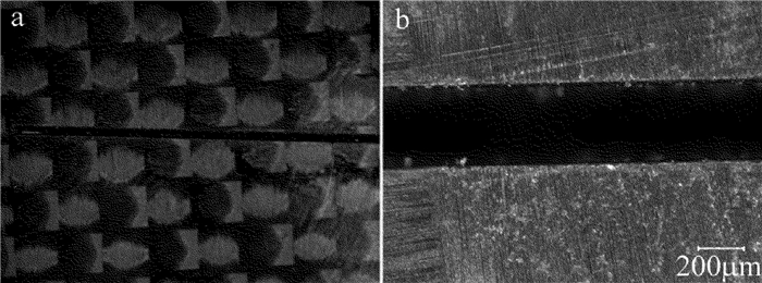 為了進一步探究切割質量,對切割后的切縫截面進行放大觀察,如圖 13所示。從圖 13a可以看出,切縫表面沒有纖維拔出現象及明顯的熱影響區,但是切縫表面略有不平整,這是因為激光能量在空間上服從高斯分布,同時在重復頻率比較低且掃描速率較快的工藝參量下切割,使得切縫表面不平整。從圖 13b可以看出,切縫有一定的錐角,這是因為即使掃描過程中采用了動態聚焦系統,掃描靠近切縫兩側的軌跡時,激光遮蔽效應仍無法避免,導致進入下表面的激光能量少,對材料的去除效果差,形成了上表面寬下表面窄的切縫,從而切縫產生錐角。