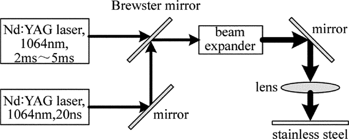 復合激光脈沖打孔實驗裝置如圖 1所示。兩束激光波長均為1064nm,毫秒激光脈寬2ms~5ms可調(diào),頻率為30Hz,單脈沖能量為2J~5J,聚焦光斑為300μm,納秒激光脈寬為20ns,頻率為10kHz,單脈沖能量為1.5mJ,聚焦光斑為100μm。兩束激光通過布儒斯特片非相干合束,經(jīng)過擴束準直,聚焦于厚度為5mm的SUS 304不銹鋼表面。