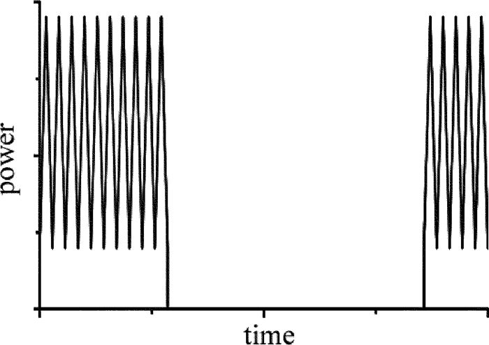 納秒脈沖的輸出由毫秒激光的脈沖有效信號控制,用以實現(xiàn)兩束激光脈沖的同步,當毫秒脈沖寬度激光脈沖輸出時納秒脈沖激光啟動輸出,當毫秒激光停止輸出時停止納秒脈沖激光的輸出,兩束激光脈沖啟動時間的延遲為微秒量級。改變毫秒激光的脈沖寬度,能夠控制一個毫秒脈沖寬度內(nèi)復合的納秒脈沖個數(shù)。兩束激光峰值功率疊加如圖 2所示。