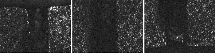 將復合脈沖激光打孔后的SUS 304不銹鋼厚板沿孔的軸向切割,在顯微鏡下觀察孔的剖面形態(tài),如圖 3所示。由于不銹鋼板較厚而顯微鏡的視場較小,5mm長的孔徑形貌需分3段拍攝,從左至右分別為孔的上、中、下3段。從圖中可以看到,小孔的入口圓度較好,出口孔徑略小于入口,孔壁略粗糙且發(fā)黑,有重鑄層。