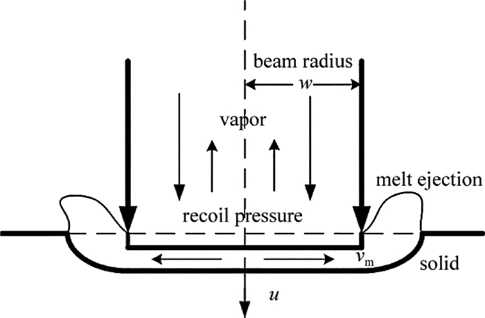 材料去除主要有以下3種排出機制:當金屬表面溫度略高于熔點,材料部分熔化,形成熔池,液體排出速率緩慢,通??刹扇≥o助氣體的方式加速液體排出;增大激光功率密度,提高液體表面溫度,部分液體蒸發(fā),氣體體積迅速膨脹,產(chǎn)生向下的反沖壓強作用于熔融液體表面,使液體濺射逸出,此時,蒸發(fā)反沖壓強是流體力學機制下液體排出作用區(qū)的主要因素;若激光功率密度繼續(xù)增加,表面溫度進一步上升,則熔融液體在到達作用區(qū)邊沿前便已蒸發(fā),此時材料更多以蒸發(fā)的方式排出[9]。本文中主要討論以蒸發(fā)反沖壓強為主的液體排出機制下,激光打孔速率與激光能量的關系。