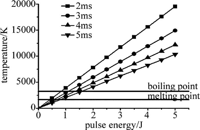 由(1)式得到不同脈寬下毫秒激光單脈沖能量與不銹鋼材料表面溫升的關系曲線,如圖 6所示。根據(jù)計算可知,使不銹鋼表面達到熔點所需的激光能量約為其達到沸點的一半。以脈寬為5ms的長脈沖為例,使不銹鋼表面達到熔點的單脈沖能量為0.82J,達到沸點的單脈沖能量為1.58J。當脈沖能量相同時,脈寬越窄,峰值功率密度越大,材料的表面溫升越高。納秒脈沖的峰值功率密度遠大于毫秒脈沖,疊加后使材料表面溫度進一步升高。