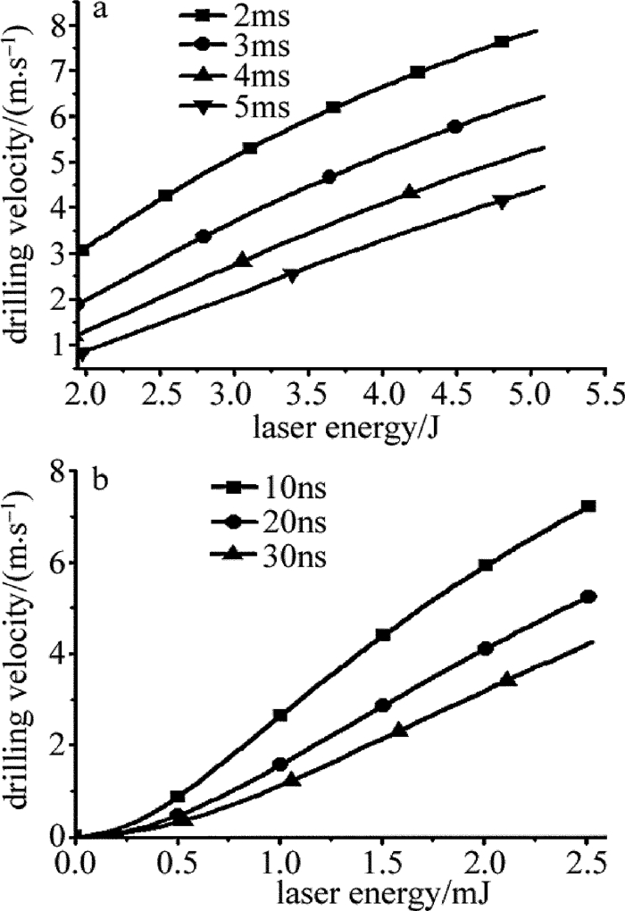 在單獨采用長脈沖打孔,考慮蒸發(fā)反沖壓強濺射熔融物質(zhì)為主的模型中,長脈沖激光能量加熱材料形成熔池,同時產(chǎn)生蒸發(fā)反沖壓強排出液體,脈寬5ms的激光單脈沖能量需大于1.58J,根據(jù)(1)式~(7)式,得到不同脈寬作用下,打孔速率與脈沖能量的關系,如圖 7a所示。
